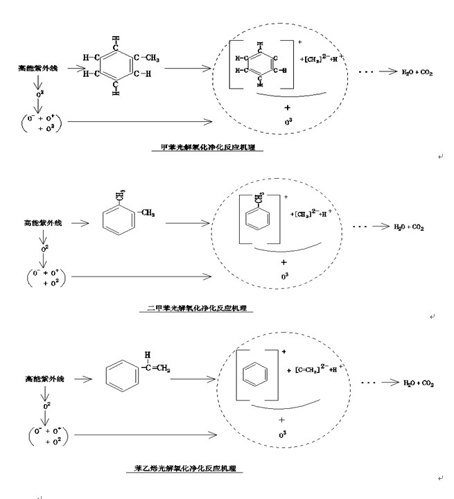 本產品利用特制的高能高臭氧UV紫外線光束照射廢氣,裂解工業廢氣如:氨、三甲胺、硫化氫、甲硫氫、甲硫醇、甲硫醚、乙酸丁酯、乙酸乙酯、二甲二硫、二硫化碳和苯乙烯,硫化物H2S、VOC類,苯、甲苯、二甲苯的分子鏈結構,使有機或無機高分子惡臭化合物分子鏈,在高能紫外線光束照射下,降解轉變成低分子化合物,如CO2、H2O等。利用高能高臭氧UV紫外線光束分解空氣中的氧分子產生游離氧,即活性氧,因游離氧所攜正負電子不平衡所以需與氧分子結合,進而產生臭氧。